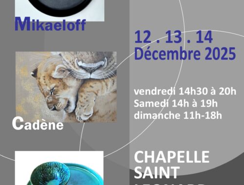 – DU 30 MARS AU 04 AVRIL 2019 (14h-18h) EXPOSITION ARTS SCIENCES & LETTRES Galerie THUILLIER 3, rue de Thorigny (à 100m. du Musée Picasso) 75003 PARIS https://www.arts-sciences-lettres.fr/presentation-arts-sciences-lettres – DU 3 AU 7 AVRIL 2019 SALON PAD PARIS (Galerie Philippe Heim | Stand 67) Jardin des Tuileries . 234 rue de Rivoli 75001 PARIS Mercredi 3 Avril – VIP Opening 11H-22H Jeudi 4 Avril – Samedi 6 Avril 11H-20H Dimanche 7 Avril 11H-18H https://www.pad-fairs.com/paris/fr/visitors/general-information/ – DU 09 AU 22 AVRIL 2019 (14h-18h30) SALON D’ARTS DU LION’S CLUB DE DRAVEIL Château de Villiers – 3, avenue de Villiers 91210 DRAVEIL – DU 20 AVRIL AU 5 MAI (14h30-18h30) 61ème SALON DES BEAUX-ARTS Salle des Fêtes, Rue Emy-les-Prés 95240 CORMEILLES-EN-PARISIS |